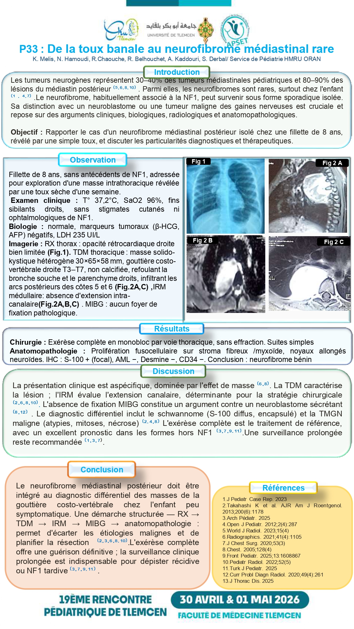 K. MELIS, N. HAMOUDI, R. CHAOUCHE, R. BELHOUCHET, A. KADDOURI, S. DERBAL Service de pédiatrie HMRU Oran Introduction : Les tumeurs neurogènes constituent 40-50 % des masses médiastinales postérieures pédiatriques, dominées par neuroblastomes/ganglioneuromes. Le neurofibrome sporadique (sans NF1) est exceptionnel (< 5