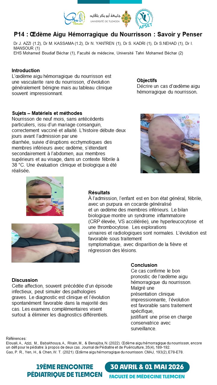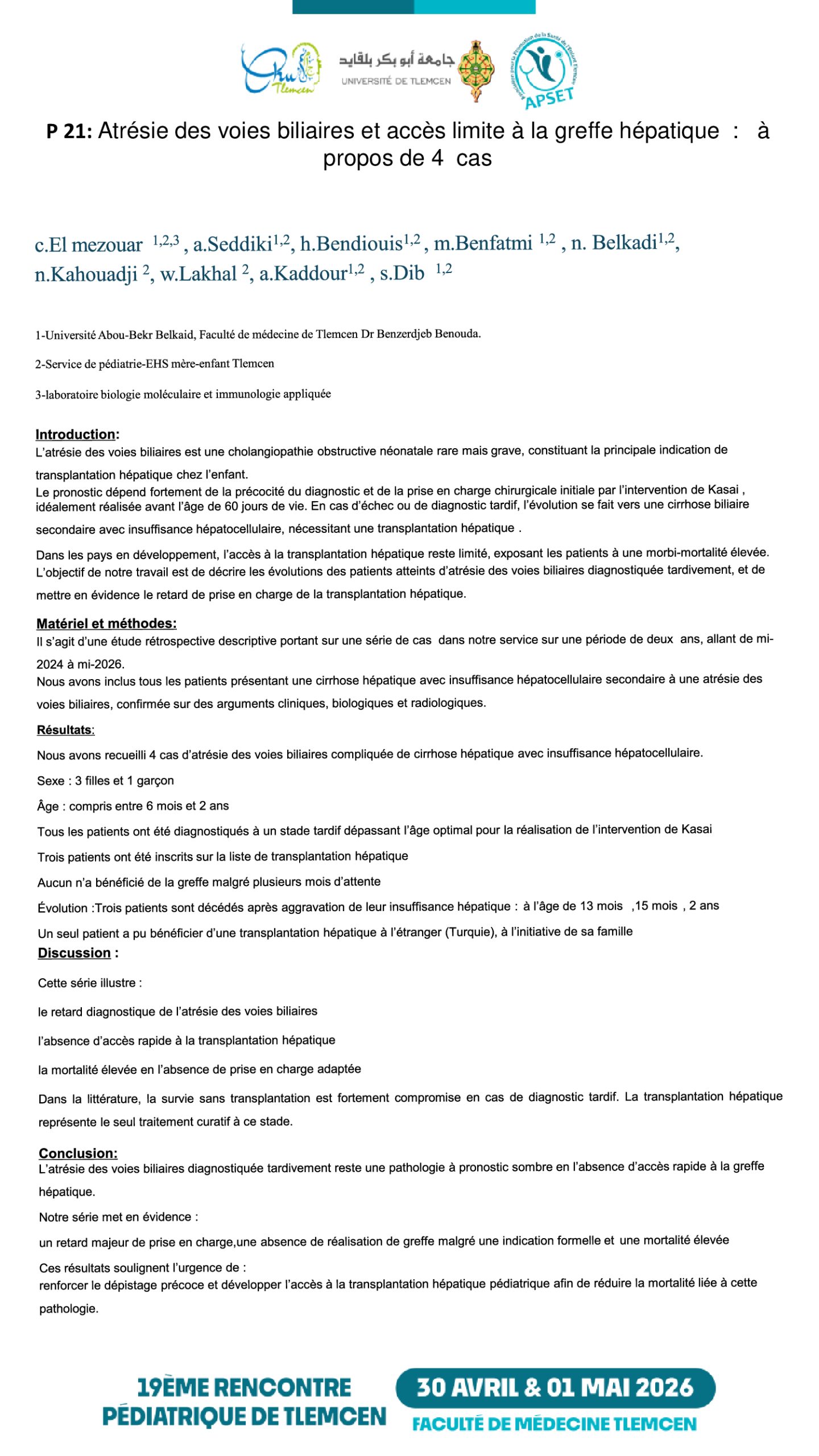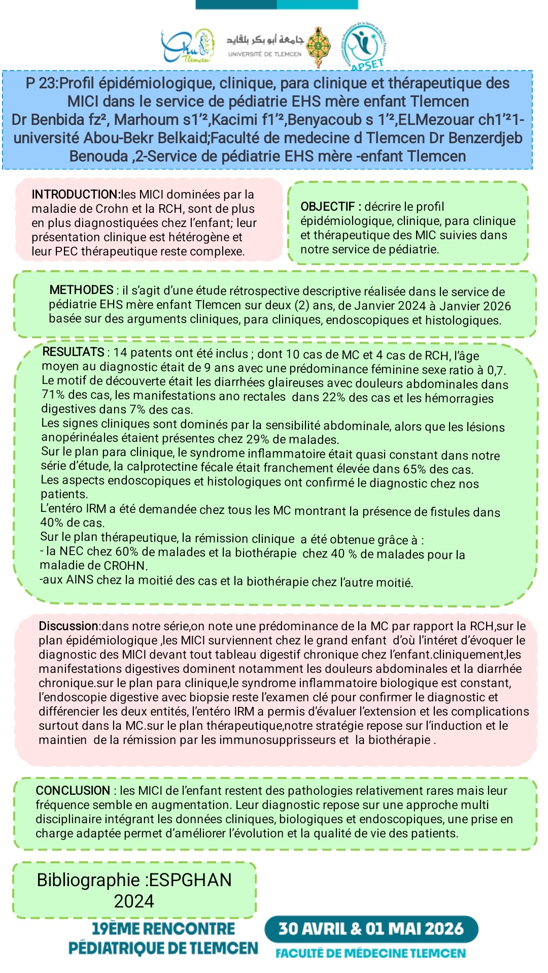F.Z. BENBIDA¹², S. MARHOUM¹², F. KACIMI¹², S. BENYACOUB¹², D.J. SELKA¹², C.H. EL MEZOUAR¹² ¹ Université Abou-Bekr Belkaid, Faculté de médecine de Tlemcen Dr Benzerdjeb Benouda ; ² Service de pédiatrie EHS mère-enfant Tlemcen Introduction : Les MICI dominées par la maladie de